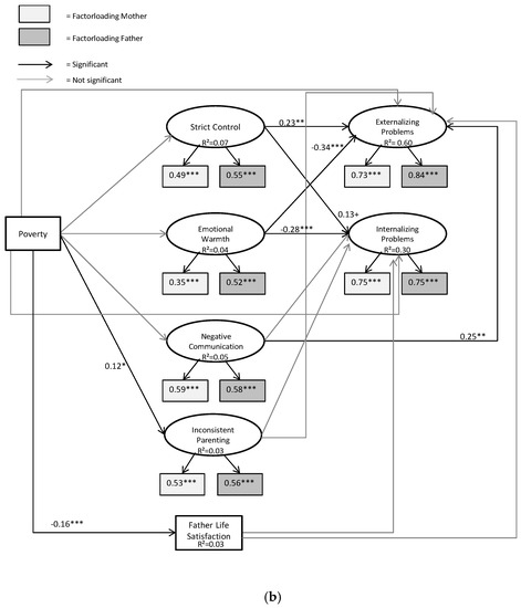 Poverty and child behavioral problems: (a) The mediating role of psychological control and mothers’ life satisfaction; (b) The mediating role of other parenting styles and fathers’ life satisfaction. Figure includes only significant mediators. N = 1097; control variables: sex, age (child and mother), migration background, number of children in the household, sample-region, and child care attendance. Model fit: chi ² = 357.407, df (125), p < 0.000, CFI 0.94, TLI 0.88, RMSEA 0.04, and SRMR 0.04. Tables including unstandardized coefficients, factor loadings, and residual covariances/correlations are available upon request. Levels of significance: *** p < 0.001, ** p < 0.01, * p < 0.05, + p < 0.1.
