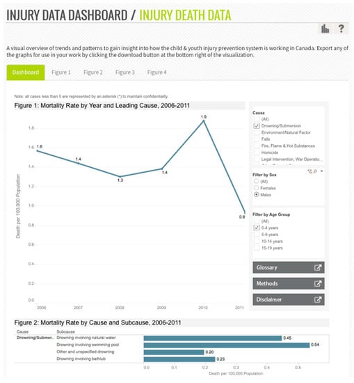 Following the BC pilot demonstration, the Atlas was scaled up with national data. The datasets that are included in both the dashboard and iDOT included hospitalization and mortality data, drowning data, transportation data, and economic burden data []. These data were obtained from Statistics Canada, CIHI, the Drowning Prevention Research Centre, Parachute, as well as through individual provinces and territories and Transport Canada. Data sharing and confidentiality agreements were negotiated and approved prior to secure data transfers. As these agreements had to be negotiated individually, there were some delays in receiving the data. All data had to be coded in a numeric format to allow for programming on the iDOT. The dashboard visualizations on the other hand, were converted into text labels for programming into Tableau.