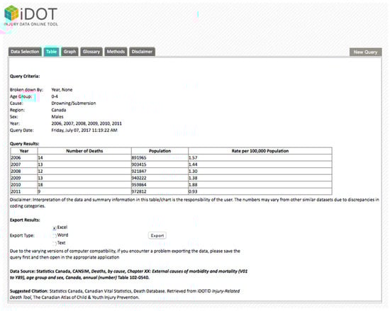 The main data selection page of the iDOT displays the data in six main sections, broken down further into topic areas. For example, the Injury Death Data section includes “region and year”, “demographics”, and “cause of injury”. Each topic area is further divided into sub-sections, which allow the user to select the information needed, such as unintentional drowning deaths in males, aged 0–4 years. The tool has been developed to allow easy navigation and minimal screen consumption. Therefore, all the parameters are stored under collapsible categories that expand when selected.
