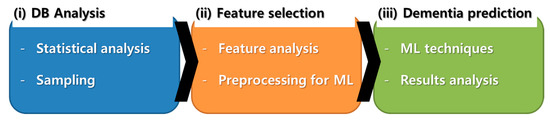 The work of many researchers in traditional studies investigating dementia have revealed the impact of medical history that includes sociodemographic and lifestyle data, medical records, and biophysical properties [15,16,17,18,19,20]. Based on medical history, many researchers have performed studies to predict dementia using big data techniques. Some studies have attempted to use medical records, and sociodemographic and lifestyle data [21,22,23]. Others have attempted to predict Alzheimer’s disease through genomic analysis, brain imaging, and medical record review [24,25,26]. Still others have attempted to predict dementia by changing the examination battery for dementia and its biophysical properties [27,28,29].