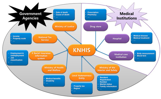 Since 1989, the KNHIS has been a legal institution of the Korean medical insurance program, and has managed all health care costs for health care recipients, providers and government agencies in the Republic of Korea. The KNHIS can collect medical records of every citizen in Korea through every registered hospital, drug store, and medical care institution. Moreover, all personal medical history data is linked with other databases of government agencies. Thus, personal, family, and socioeconomic information can be used through the network, as shown in Figure 2.
