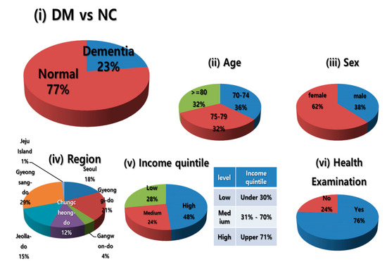 Table 2 summarizes the composition of the KNHIS-SC DB population according to age and year. Data from 2002 to 2013 for the population that was 60 years of age or older as of 2002, were generated to form a total of 672 levels according to sex, region, and income quintile. Figure 3 illustrates the composition ratio according to the following criteria: (i) dementia group (DM) vs. normal control group (NC), (ii) age, (iii) sex, (iv) region, (v) income quintile and (vi) previous health examination history.