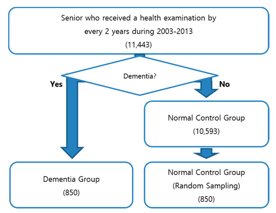 The proposed research aimed to early predict dementia and improve an individual’s diagnostic performance, and used a biomedical big data approach that included personal disease history, sociodemographic data, and personal health examination, referred to herein as “personal medical history”. The KNHIS-SC DB contains information regarding participant insurance eligibility, medical treatment, and general health examination data for all Koreans [14]. Several machine learning (ML) techniques have been applied to incorporate useful features from the data in the DB. Section 2 presents several previous studies, and the methodology is explained in Section 3. Section 3 contains the introduction of KNHIS-SC DB with several statistics, feature selection, and approaches to support the effectiveness of personal medical history. Our experimental results, the discussion, and conclusion are described in Section 4, Section 5 and Section 6, respectively.