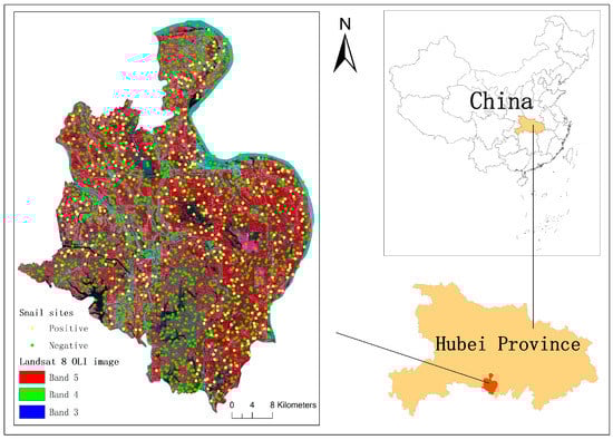 - Zhang, Z.Y.; Xu, D.Z.; Zhou, X.N.; Zhou, Y.; Liu, S.J. Remote sensing and spatial statistical analysis to predict the distribution of Oncomelania hupensis in the marshlands of China. Acta Trop. 2005, 96, 205–212. [Google Scholar] [CrossRef] [PubMed]