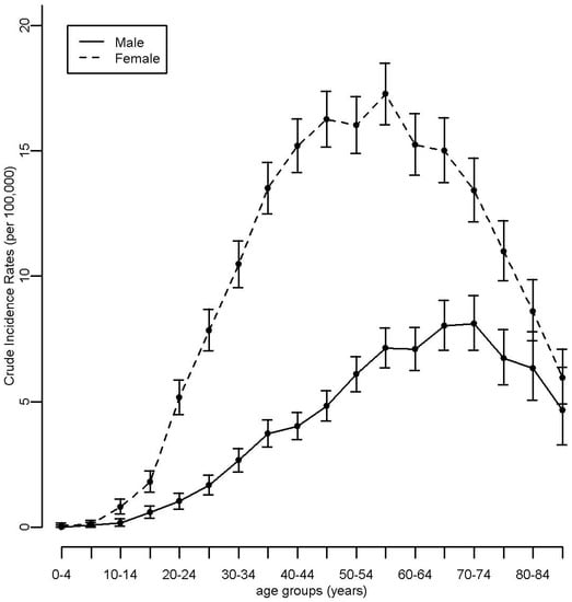 - Davis, S.; Kopecky, K.J.; Hamilton, T.E.; Onstad, L.; Hanford Thyroid Disease Study Team. Thyroid neoplasia, autoimmune thyroiditis, and hypothyroidism in persons exposed to Iodine 131 from the Hanford nuclear site. JAMA 2004, 292, 2600–2613. [Google Scholar] [CrossRef] [PubMed]