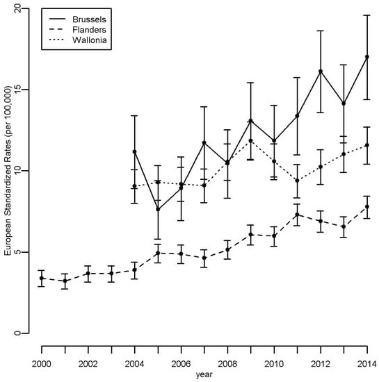 Demoury, C.; De Smedt, T.; De Schutter, H.; Sonck, M.; Van Damme, N.; Bollaerts, K.; Molenberghs, G.; Van Bladel, L.; Van Nieuwenhuyse, A. Thyroid Cancer Incidence around the Belgian Nuclear Sites, 2000–2014. Int. J. Environ. Res. Public Health 2017, 14, 988. https://doi.org/10.3390/ijerph14090988