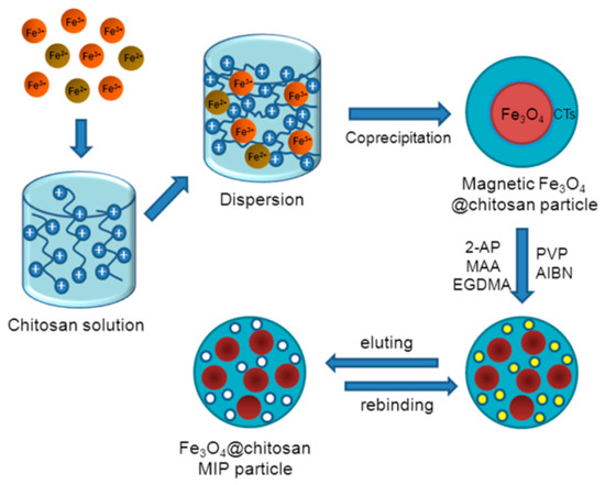 The Fe3O4-CTs@MIP was synthesized by the molecular imprinted method as described in Figure 1. Typically, 2-aminopyridine (1 mmol) was dissolved in 10 mL of acetonitrile: toluene (75:25, v/v) in a three-necked flask. Then, MAA (4 mmol) was added and stirred for 1 h. Subsequently, 100 mL of acetonitrile: toluene (75:25, v/v) containing 300 mg of Fe3O4-chitosan particles and 1.0 mL oleic acid were added and continuously stirred under ultrasonication for 20 min. The dispersant PVP (0.4 g), EGDMA (20 mmol) and AIBN (90 mg) were added successively to the mixture. The final mixture was purged with nitrogen while the reaction temperature increased to 60 °C and then maintained at 60 °C for 24 h. After polymerization, the Fe3O4-CTs@MIP was collected with an external magnet and Soxhlet extracted with methanol: acetic acid (9:1, v/v) until the template could not be detected in the filtrate. The obtained polymer was dried under vacuum overnight at 50 °C. Additionally, a magnetic non-imprinted polymer (Fe3O4-CTs@NIP) was synthesized with a similar procedure but without adding the template. To establish the reproducibility of the Fe3O4-CTs@MIP preparation protocols, three batches of polymer strictly following the protocol outlined above were conducted.