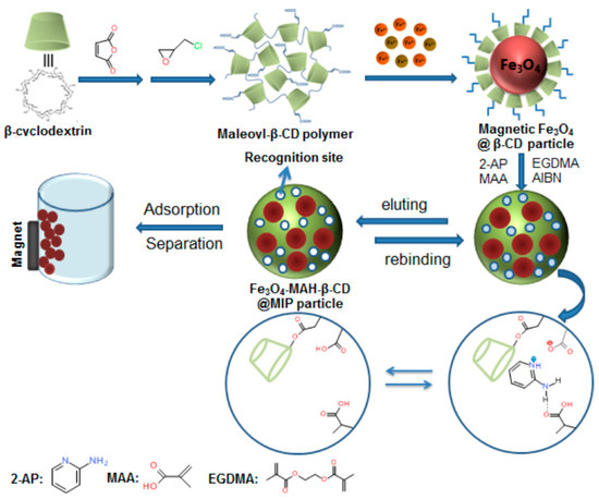Among these surface-imprinted polymers, chitosan- (CTs) and cyclodextrin (CD)-based polymers have received much attention for the removal of contaminants in recent years [20,21,22]. Chitosan as a useful commercial polymer contains numerous amino and hydroxyl functional groups, which can provide the flexibility for structural modifications and molecularly imprinted polymers preparation [23]. β-cyclodextrin (β-CD) with 7 d-glucopyranonsyl residue form a ring by α-1,4-glucosidic bonds, including a hydrophobic inner cavity and a hydrophilic outer surface. Due to their special structure, various targeted molecules can be easily bonded into β-CD specific cavities and react with the hydroxyl groups located on the surface, to form stable inclusion complexes through intermolecular interactions during the imprinting process [24]. In addition, effective and quick separation of the adsorbents from contaminated water is of great importance in wastewater treatment. Magnetic separation technique is a good method; it is quick and convenient to separate magnetic polymers from a complex matrix by an external magnetic field [25,26].