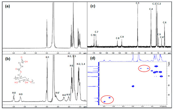 1NMR spectra of β-CD in D2O (a); NMR spectra of MAH-β-CD in D2O. 1H spectrum (b); 13C spectrum (c); 2D HSQC 13C–1H plot (d).