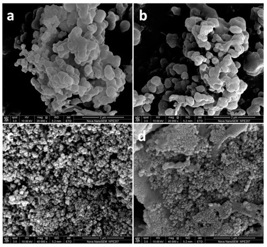 The surface morphologies of Fe3O4-CTs@MIP, Fe3O4-CTs@NIP, Fe3O4-MAH-β-CD@MIP and Fe3O4-MAH-β-CD@NIP were characterized by SEM. Figure 4a,b showed no significant differences between Fe3O4-CTs@MIP and Fe3O4-CTs@NIP on SEM images. It can be found the morphologies with the agglomerate consisted of several spherical magnetite particles. The SEM of the prepared Fe3O4-MAH-β-CD@MIP and Fe3O4-MAH-β-CD@NIP is presented in Figure 4c,d. The Fe3O4-MAH-β-CD@MIP and Fe3O4-MAH-β-CD@NIP showed appreciable differences in morphology. The Fe3O4-MAH-β-CD@NIP crosslinking is more compact, whereas the Fe3O4-MAH-β-CD@MIP exhibited more rough and porous structures than that of Fe3O4-MAH-β-CD@NIP, indicating that the removal of template molecules resulted in possible recognition sites in Fe3O4-MAH-β-CD@MIP. It is favorable for the formation of dimensional multiple-point binding sites. The particle size of Fe3O4-MAH-β-CD@MIP was also uniform.