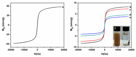 The magnetic properties of the Fe3O4 particle, Fe3O4-MAH-β-CD@MIP, Fe3O4-MAH-β-CD@NIP, Fe3O4-CTs@MIP and Fe3O4-CTs@NIP were investigated by VSM as shown in Figure 6. It was clear that there was no hysteresis, and the symmetrical pass through the origin in the magnetization curves, indicates that all these magnetic particles retained super-paramagnetic properties. The saturation magnetization values (Ms) were 57.8 emu·g−1, 8.2 emu·g−1, 7.3 emu·g−1, 4.6 emu·g−1 and 3.8 emu·g−1. Compared with the pure Fe3O4, the saturation magnetization of polymers decreased significantly, which might be due to the decrease in the ratio of magnetic substances after the polymerization. However, Fe3O4-CTs@MIP and Fe3O4-MAH-β-CD@MIP can be separated rapidly from suspensions under an external magnetic field. The magnetic adsorbents adhered to the walls of the vial, and the supernatant became clear and transparent as shown in the inserted photograph marked with the letter “f”.
