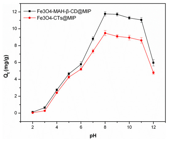 The effect of solution pH was investigated with the pH values ranging from 2.0 to 12.0, and the results are shown in Figure 7. It is clearly observed that the pH value had a great influence on the adsorption of 2-aminopyridine for the Fe3O4-CTs@MIP and Fe3O4-MAH-β-CD@MIP. The compound 2-aminopyridine has two nitrogen atoms; each has lone pair electrons to donate, but the ring nitrogen atom is known to be more basic in comparison with amino nitrogen. Based on the pKa value of 2-aminopyridine (pKa = 6.86), in a low pH solution, the ring nitrogen atom of 2-aminopyridine and amino group on the surface of Fe3O4-CTs@MIP is easily protonated, resulting in the fact that the 2-aminopyridine and adsorption sites of Fe3O4-CTs@MIP carried positive charges. The strong electrostatic repulsion makes the adsorption weak. This behavior is consistent with previous reports [32,33]. In addition, the carboxyl groups grafted on Fe3O4-MAH-β-CD@MIP rarely dissociate under a low pH condition. In this case, the electrostatic interaction between polymers and 2-aminopyridine is quite weak, resulting in low adsorption ability. Therefore, they have similar weak adsorption behavior at low pH. With the increase in pH, the dissociation degree of the carboxyl groups increases, making the electrostatic repulsion weaker and electrostatic interaction stronger. Meanwhile, the carboxyl group on the surface of Fe3O4-MAH-β-CD@MIP can form hydrogen bonds with amino nitrogen of aminopyridine, which makes more binding sites available. Thus, more 2-aminopyridine could be adsorbed onto the imprinted polymers. With the help of two interactions, the adsorption capacity rises rapidly when the solution pH is in a range of 6–8. The uptake of 2-aminopyridine onto Fe3O4-CTs@MIP may mainly contribute to hydrogen bonding between the hydroxyl group in chitosan and the amino group in 2-aminopyridine. The experimental results proved that the interaction between 2-aminopyridine and Fe3O4-CTs@MIP was slightly lower than that of Fe3O4-MAH-β-CD@MIP. When pH > 8, the weakening effect of the electrostatic interaction between polymers and 2-aminopyridine was displayed obviously, leading to a lower adsorption capacity. Therefore, the optimal pH value of 8 was chosen for subsequent adsorption studies.