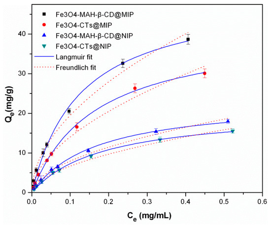 The adsorption amounts of 2-aminopyridine versus the corresponding equilibrium concentration at 298 K were plotted as adsorption isotherms in Figure 8. With increasing 2-aminopyridine concentration, the adsorption capacity of 2-aminopyridine was increased clearly. The calculated isotherm parameters accompanied with standard errors of Fe3O4-CTs@MIP, Fe3O4-CTs@NIP, Fe3O4-MAH-β-CD@MIP and Fe3O4-MAH-β-CD@NIP for 2-aminopyridine adsorption was summarized in Table 1. Standard errors of three experiment replicates are within the range from 2.8 to 6.4%. By comparing the regression coefficients (R2), the Langmuir model fitted the data better compared to the Freundlich model. This indicated that adsorption might occur on the homogeneity active sites of the absorbent surface. The maximum adsorption capacities of 2-aminopyridine binding to Fe3O4-CTs@MIP and Fe3O4-MAH-β-CD@MIP calculated by the Langmuir isotherm model were 39.2 mg·g−1 and 46.5 mg·g−1, respectively, which were higher than those on the Fe3O4-CTs@NIP and Fe3O4-MAH-β-CD@NIP. This revealed that the synthesized MMIP had more specific sites than the MNIP for the template molecules.