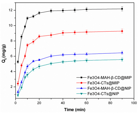 Figure 9 shows a time-dependent adsorption dynamics of 2-aminopyridine on Fe3O4-CTs@MIP, Fe3O4-MAH-β-CD@MIP and MNIPs at optimized pH and room temperature. The adsorption of all these four adsorbents was fast in the first 20 min and then achieved equilibrium after approximately 30 min. This was mainly due to the existence of a large number of active sites on the surface of adsorbents at the beginning. However, with the increase in the contact time, the slope of the adsorption capacity increased slowly, which might be attributed to the gradual occupation of the binding sites on the adsorbent surface by aminopyridine, resulting in decreased adsorption rate at the later stage. In addition, it was observed that the capacity of the adsorbed 2-aminopyridine on Fe3O4-CTs@MIP and Fe3O4-MAH-β-CD@MIP at any time was considerably greater than that of the corresponding MNIPs. This was mainly due to the specific recognition effect and affinity binding sites in imprinted polymers. The pseudo-first order [37] and pseudo-second order models [38] were used to evaluate the adsorption kinetics, which are described in the following Equations (4) and (5), respectively:
