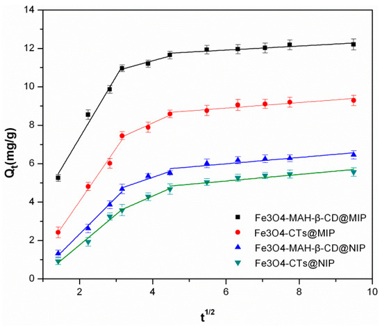 Intraparticle diffusion model for 2-aminopyridine adsorption onto Fe3O4-CTs@MIP, Fe3O4-CTs@NIP, Fe3O4-MAH-β-CD@MIP and Fe3O4-MAH-β-CD@NIP.