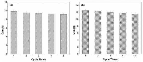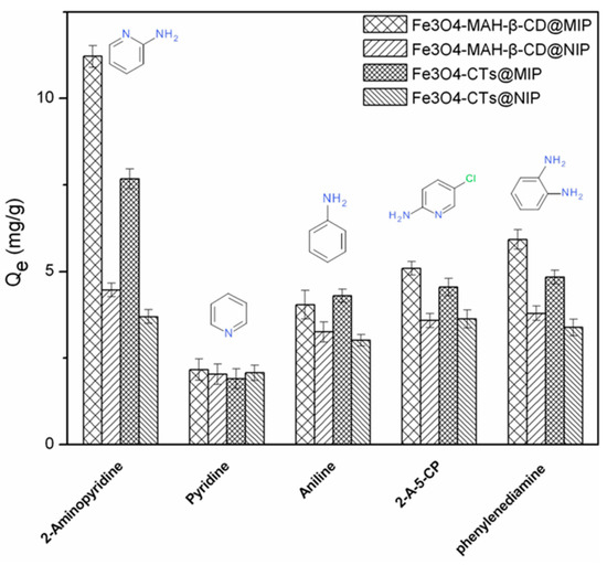 The regeneration properties of Fe3O4-CTs@MIP and Fe3O4-MAH-β-CD@MIP after adsorption were investigated to understand the possibility of further practical application. As shown in Figure 14, the synthesized MMIPs can be regenerated after washing with methanol/acetic acid (90:10, v/v). Their adsorption efficiencies were stable for up to five adsorption—regeneration cycles without a considerable decrease for 2-aminopyridine. After the fifth regeneration, the reduction in the adsorption capacity of Fe3O4-CTs@MIP and Fe3O4-MAH-β-CD@MIP for 2-aminopyridine was only 6.9% and 7.6%, respectively. The result indicated that Fe3O4-CTs@MIP and Fe3O4-MAH-β-CD@MIP are desirable for potential application in future.