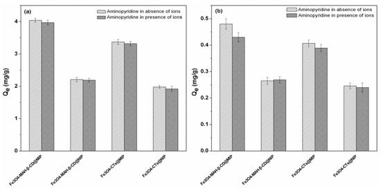 In the presence of coexistent ions including Na+, K+, Mg2+, Ca2+, Cl− and SO42− in water samples, the binding efficiency and selective ability of Fe3O4-CTs@MIP, Fe3O4-CTs@NIP, Fe3O4-MAH-β-CD@MIP and Fe3O4-MAH-β-CD@NIP for 2-aminopyridine were investigated and the results are presented in Figure 12. It is observed that the binding capacity of synthesized MMIPs and MNIPs shows no significant change in both the absence and presence of various ions in water samples. This means that the binding was hardly influenced by the coexisting ions in water. Thus, the MMIPs synthesized in our work were possibly involved in detecting or removing 2-aminopyridine in water.
