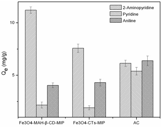 For comparison, the adsorption and selective performance of the synthesized MMIPs were compared with those of commercial granular activated carbon (GAC) for the treatment of 2-aminopyridine and analogues in water. GAC is activated carbon with particle sizes predominantly greater than 80 mesh and a surface area between 900 and 1110 m2·g−1. As shown in Figure 13, owing to the imprinting effect, two MMIPs showed a higher recognition and selective ability to 2-aminopyridine compared with activated carbon. The Fe3O4-MAH-β-CD@MIP exhibited the greatest affinity among the three adsorbents. The commercial activated carbon material showed a similar adsorption ability to all three organic substances, and the selectivity was not obvious.