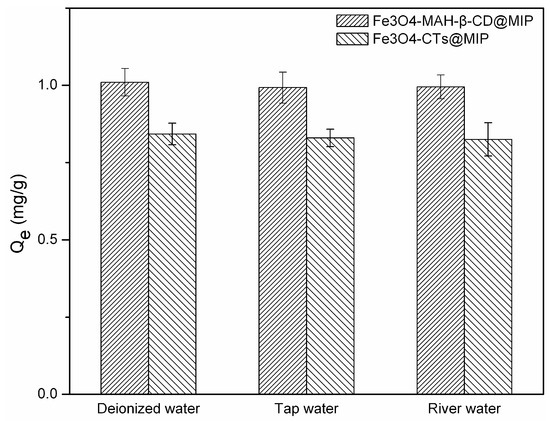 As shown in Figure 15, there was no significant difference for the adsorption amount of synthesized MMIP for 2-aminopyridine in deionized water, tap water and real river water samples. The results indicated that, owing to the existence of specific binding sites in Fe3O4-CTs@MIP and Fe3O4-MAH-β-CD@MIP, the MMIPs have a good adsorption performance for 2-aminopyridine with high selectivity and efficiency in all kinds of experimental water samples.