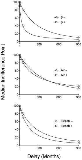 Different ideas, however, have been drawn by Gattig and Hendrickx ([24], see also [15,21]) who concluded that based on a review of the literature, choices for environmental outcomes (risks in particular) across time are fundamentally different from choices for financial outcomes. According to Gattig and Hendrickx [24], differences in choices between environmental and monetary outcomes may be a result of increased ethical concerns and emotion associated with environmental choices. More within-subject research using the same methodology (rather than conclusions drawn from multiple studies using different methodologies) is needed to draw firm conclusions on relations between decision-making processes associated with delayed air quality, health, and financial outcomes for theoretical and public health policy implications.