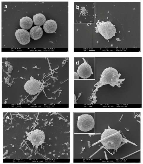 Intact mast cell granules enveloped by their individual perigranular membranes were obtained by mild sonication (1 min at 50% power in Bandelin Sonopuls Sonifier UW2070, Berlin, Germany) of the MC suspension as described by Lindstedt and Kovanen [83]. Granule remnants were obtained by weak 48/80 stimulation (15 min with 1 μg/mL 48/80) of MC as previously described [83]. Granule structures were incubated with 100 μg/mL mineral fibers for 30 min at 37 °C, and then processed for scanning electron microscopy.