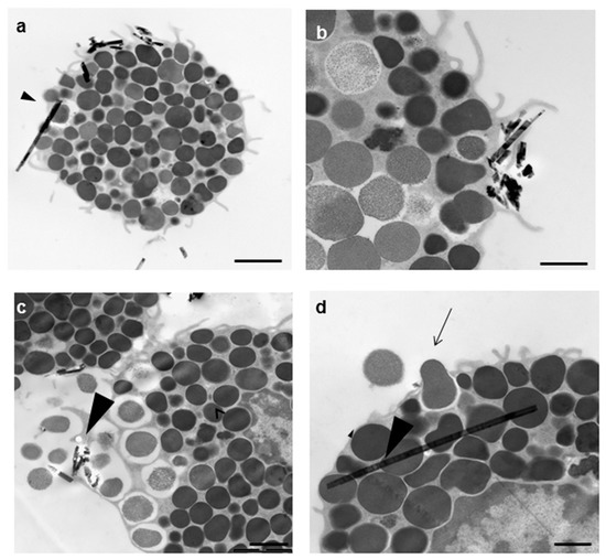 Transmission electron microscopy appearance of an RPMC exposed to 100 µg/mL of crocidolite fibers. After 30 min of incubation, the interacting fibers appear to undergo ingestion (a,b) or are free in the cytosol (arrowhead in (a,d)); (c) a degranulation process is evident where asbestos fibers are present; (d) the RPMC releasing a single granule (arrow). Magnifications: bar in (a) = 2 µm; bar in (b) = 1 µm; (c) = 2 µm; (d) = 0.5 µm.