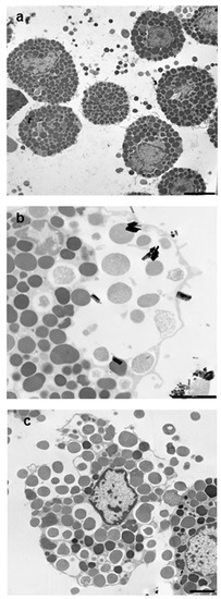 Since the more potent effect was registered with CRO fibers, these were used to stimulate RPMCs for TEM analysis. The objective was to investigate whether, as already shown for TiO2 nanoparticles [5,7,31], asbestos fibers can also penetrate RPMCs. CRO interacts with the RPMC surface in different ways: some fibers are embraced by MC pseudopodia and presumably ingested (Figure 4a–c), while some simply adhere, and the majority seem to be included in the RPMC cytosol (arrowhead in Figure 4a,d), while only rarely can a phagosome be seen surrounding them. The appearance of TEM suggests that the secretion can be carried out through: (1) active single granule secretion (Figure 4d arrow) and the conventional compound exocytosis pathway (Figure 5b), when the granule membranes fuse to each other, forming large vacuoles whose content is subsequently released extracellularly in one step; and (2) following membrane rupture and passive granule expulsion (Figure 5c). It is worth noting that the ultrastructure of asbestos-challenged RPMCs showed a weaker reaction to fiber exposure when analyzed by TEM and SEM than that observed by light microscopy. Most of the cells were intact and only rarely exhibited an explosive reaction. Almost all the RPMCs interacting with the fibers showed signs of activated secretion. It can be excluded that the nude asbestos fibers visible in the cytosol are artefacts introduced by the preparation and processing of the cell sections for TEM analysis, since serial sections of the same cell show the presence of the same fiber spanning either 120 or 720 nm in depth (see Supplementary Figures S5 and S6). The analysis of an eosinophil gave the same result (Supplementary Figure S7).