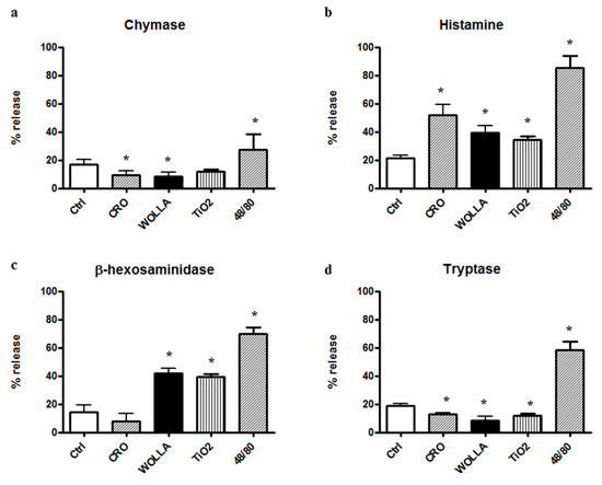 The morphological appearance of MCs stimulated by CRO or TiO2NWs suggests that a large amount of granule content has been secreted into the extracellular medium. To confirm this hypothesis, we analyzed the stimulated RPMC population for the presence of granule components in the incubation medium.