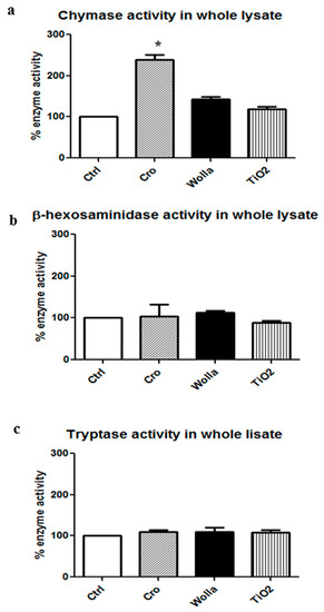 Figure 6 shows that a potent secretion was elicited by 48/80. A significant histamine release was found in the supernatant of RPMC challenged with CRO, but at a lower extent compared to 48/80. The other types of fibers elicited a weaker, but significant effect. However, despite the morphological appearance, the amount of soluble granule enzyme activity following incubation with fibers was not increased compared to that separated from unstimulated control (CTRL) cells. In the case of CHY and TRY, enzymatic activity was significantly lower (p < 0.05) while β-hexo appeared to be significantly released from RPMCs stimulated by TiO2NWs and WOLLA, but not by CRO (Table 1). This discrepancy may be explained by two possibilities: (1) an inhibitory effect exerted by the fibers on the enzymes; and/or (2) binding between fibers and either enzymes or intact granules. We therefore investigated whether asbestos fibers and TiO2NWs can bind and/or affect the activity of these enzymes. Figure 7a,b show that mineral fibers cannot inhibit RPMC enzymes. Surprisingly, the lysate of mast cell exhibits a significant increase in CHY activity following an incubation of 30 min with CRO. The incubation with WOLLA and TiO2NWs elicited a minor increment (on the average, not significant). Similarly, the activity of β-hexo and TRY was not significantly affected.