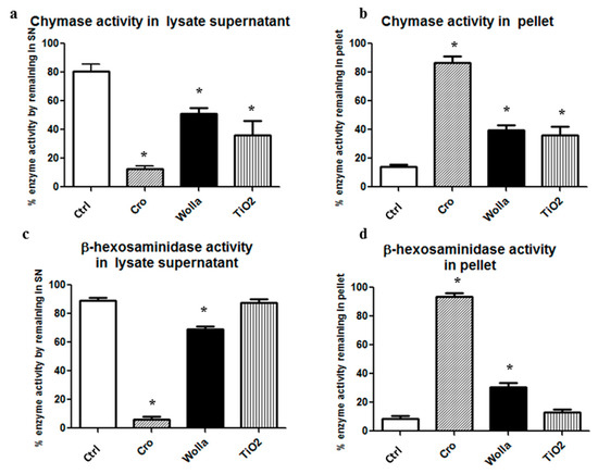 Extent of RPMC lysate enzyme absorption on mineral fibers. After 30 min incubation of the lysate in the presence of fibers (100 μg/mL), the supernatant was obtained by centrifuging the mixture at 250× g for 15 min at 4 °C. (a,b) fractionation of chymase activity; (c,d) fractionation of β-hexosaminidase activity. Significant changes in activity in the samples exposed to mineral fibers vs. baseline value (see the legend to Figure 7) are indicated by asterisks (p < 0.05). CTRL = control unstimulated cells; Cro = crocidolite-exposed enzyme; Wolla = wollastonite-exposed enzyme; TiO2 = TiO2NW-exposed enzyme.