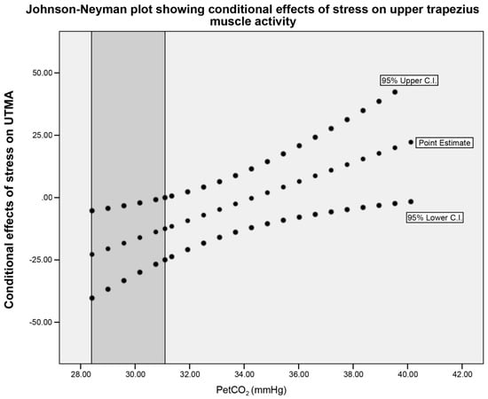 Johnson-Neyman graph showing the range of PetCO2 values where significant effects of stress on upper trapezius muscle activity occurred.
