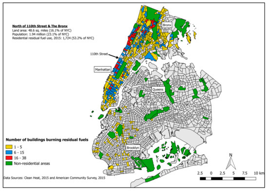 Residual fuel oils are diesel-based fuels that remain after gasoline and distillate fuels have been removed from crude oil [7]. Research shows that residual fuels produce higher levels of particulate matter (PM) than any other diesel type, largely due to their elevated sulfur composition [8]. The NYC Department of Health and Mental Hygiene (NYC DOHMH) estimated that even a 10% reduction in PM2.5 would save hundreds of lives annually, yet NYC remained one of the only municipalities in the country that still allowed the use of residual fuel oil #6 [9]. Of the approximated 10,000 buildings that burned residual fuel oils in 2007, roughly 6000 burned #6 while 4000 burned #4 and were dispersed throughout Manhattan (mostly) and other parts of the city [1]. Residual fuel oils #4 and #6 had historically been cheaper than ‘cleaner’ options such as natural gas and distillate fuels—likely explaining their continued use in NYC [10,11]. Unfortunately, residual fuels also yield higher pollutant concentrations upon combustion [12]. Air pollutants such as PM, ozone (O3), carbon monoxide (CO), sulfur dioxide (SO2), lead, and nitrogen dioxide (NO2) are all regulated as criteria air pollutants by the Environmental Protection Agency (EPA) via the National Ambient Air Quality Standards and their health impacts are widely acknowledged [13]. Two lesser known, but nonetheless harmful, air contaminants are nickel and vanadium. These substances have exhibited strong positive associations with cardiovascular disease in laboratory and population studies [14]. Nickel and vanadium are of lesser concern nationwide because they remain at significantly smaller concentrations outside of the NYC Metropolitan area [14]. Scientists concluded that the continued use of residual fuel oils were the major contributor to elevated nickel and vanadium levels in NYC [15]. Beyond the obvious health benefits from reducing PM2.5, nitrous oxides (NOx), nickel, and vanadium, the reductions would likely have the added an opportunity for greenhouse gas mitigation [16,17].