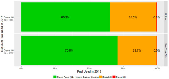 Proportionally fewer #6-burning buildings in Uptown transitioned to clean fuels between 2011 and 2015 compared to all of NYC. Figure 3 demonstrates that of the 1818 #6 burning buildings in Uptown, only 1186 (65.2%) transitioned to cleaner fuels, whereas throughout NYC, of the 4257 buildings using #6, 3016 (70.8%) transitioned to clean fuels.