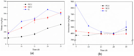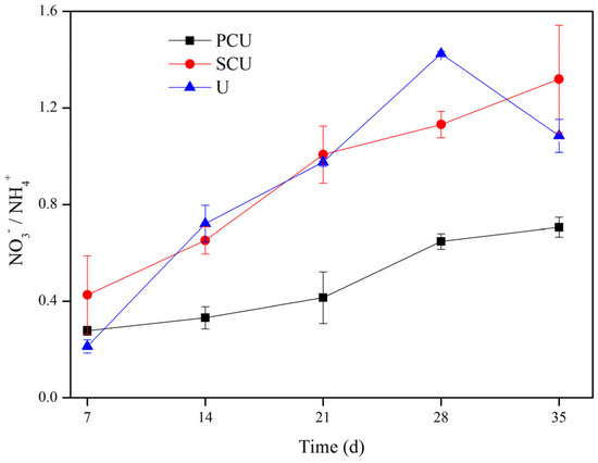 Generally, the NO3−/NH4+ ratio in soils with three N sources increased during the experiment, and the increasing rate with the application of PCU was lower than with the application of SCU and U (Figure 2). At early stages, the NO3−/NH4+ ratios with three treatments were similar, all lower than 1.0. With time, the NO3−/NH4+ ratios in the soils treated with U and SCU surpassed 1.0, while the ratio of the soil treated with PCU did not. Obviously, the NO3−/NH4+ ratio in soils treated with PCU was lower than that in soils treated with U and SCU, which revealed that PCU was more effective in maintaining lower soil NO3−/NH4+ ratios and more suitable for crop growth.