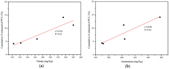 Correlation between cumulative nitrogen release rate of PCU and (a) nitrate and (b) ammonium in soil.
