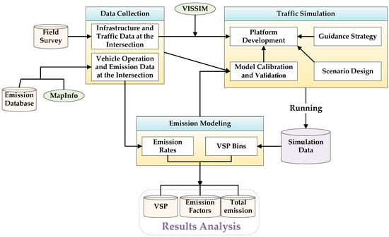First, in the data collection, an infrastructure data set and a traffic data set were collected at a real-world intersection through a field survey. These data were used to establish the simulation platform. A vehicle operations data set and an emission data set were selected using the MapInfo from an existing vehicle emission database for calculating emission rates.