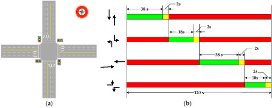 A signalized intersection of Fuchengmen Avenue and Xisi Avenue in Beijing was selected as the test bed to develop a simulation model in this research. At this intersection, geometry, signal, and traffic flow data have been collected. Geometry data include the size of the intersection and the lanes of each approaching direction. As shown in Figure 2a, each approaching direction comprises three lanes, which are a left-turn lane, through lane, and right-turn lane. The existing signal phases have been investigated. Through the field survey, there was four-phase at the signalized intersection. In the south-north direction and the east-west direction, the durations of straight and left-turn green light phase were 38 s and 18 s, respectively. The durations of amber signal light were 2 s. The cycle length is 120 s. The actual signal phases were all used to develop the simulation platform. Figure 2b presents the existing signal phases. Traffic data include the type of vehicles and traffic volumes. These data were collected through a field survey. Some data were collected using camera, such as the existing signal phases.