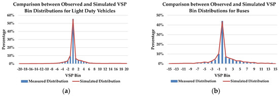 Comparison between observed and simulated VSP bin distributions: (a) light duty vehicles; (b) buses.