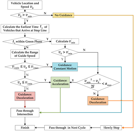 The COM interface in VISSIM was used to implement the algorithm of the cooperative vehicle-infrastructure control. In this algorithm, drivers are guided with speed advice at the intersection. Restricted by regular routes and stations, buses are not provided with speed advice. Therefore, the cooperative vehicle-infrastructure system works only for light duty vehicles. When light duty vehicles enter the influencing area (a circle of radius 150 m), their instantaneous locations and speeds are sent to the control center. According to the real-time signal status, the control center determines the guidance speed and provides advice to the vehicles [12]. The guidance advice was proposed to make the vehicle pass through the intersection in the present green light phase or the next green light phase as much as possible. The comparison of the real-time speed of vehicle and a series of threshold velocities was conducted to determine the guidance strategies. Figure 4 presents the guidance process.