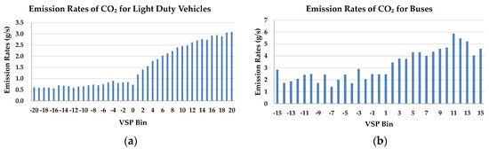 Emission rates of CO2 in each VSP bin: (a) Light duty vehicles; (b) Buses.