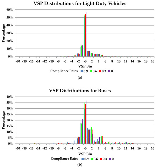 VSP distributions of light duty vehicles and buses were calculated for 11 compliance rates ranging from 0 to 1 using Equations (2) and (3). The VSP distributions under compliance rates of 0, 0.3, 0.6, and 0.9 are illustrated in Figure 6 as examples.