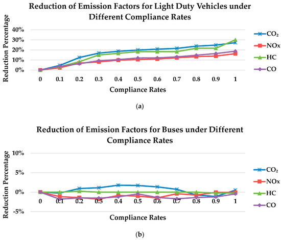 Reduction of emission factors under different compliance rates: (a) light duty vehicles; (b) buses.