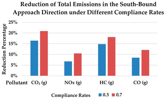 Reduction of total emissions in the southbound approach direction under different compliance rates.