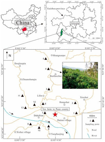 The study area (Puan County) which lies at 25°28′31″–26°10′35″ N and 104°51′10″–105°09′24″ E is located in southwest Guizhou Province (Figure 1), southwestern China. The altitude ranges from 1000 m to 1300 m. The average annual temperature is about 14 °C, with an average annual sunshine duration of 1563 h and an average annual precipitation of 1395.3 mm [20]. Puan is considered the birthplace of tea in the world, and is known as “the hometown of Chinese ancient tea trees” and “the hometown of Chinese tea culture”. Tea trees are mainly cultivated on the upper Permian Longtan Formation, and the bedrock is composed of terrestrial siliceous clastic rocks, such as sandstone, mudstone, and shale. Furthermore, the soil type is sandy yellow soil. The different tea varieties grown in Puan tea growing area include China Yunnan big leaves tea, Kunming little leaves tea, Fuding big white tea, Wuniu zao tea, and Longjing 43.