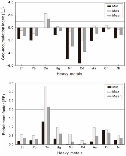 To identify heavy metal pollution levels in soil, various methods have been proposed. In this study, the geo-accumulation index (Igeo), enrichment factor (EF), and potential ecological risk index (RI) were applied to identify the levels of metal pollution in soil. The minimum, maximum, and average values of Igeo and EF for different heavy metals in the surface soil were shown in Figure 2. Based on the Igeo, the contamination of the investigated surface soil samples by Cu is characterized by the following criteria: uncontaminated to moderately contaminated, moderately to heavily polluted, and moderately contaminated based on the minimum (0.006), the maximum (2.222), and the average value (1.371), respectively. The average values of Igeo for the other metals (Zn, Pb, Hg, Mn, Cd, As, Cr, and Ni) in soil were less than zero, indicating that the soils were not contaminated. However, for As, Cr and Hg, the maximum Igeo values were 0.271, 0.355, and 0.173 in surface soils, respectively, suggesting that the soil was uncontaminated to moderately contaminated. In brief, based on the obtained average values of the geo-accumulation index (Igeo), the order of heavy metals in surface soils, respectively, were as follows: Cu > Cr > Hg > As > Ni > Zn > Pb > Mn > Cd.