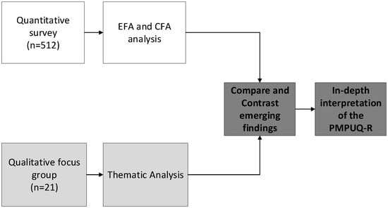 This study used a mixed methods methodological approach with a convergent parallel design. A mixed methods approach allowed for bridging two research traditions regarding problematic smartphone use by means of integrating large-scale psychometric inquiry with a qualitative analysis on personalized experiences, allowing for a better understanding of the validity of the PMPU-Q-R. Fetters et al. [29] identified a convergent parallel design as a suitable mixed method for investigating the validity of quantitative measures. Design convergence in this case refers to decreasing PMPU-Q measurement uncertainty by using different methods [29]. The updated PMPU-Q (PMPU-Q-R) was administered to a sample of smartphone users, together with a number of relevant other validated psychometric measures, to determine the construct validity and internal consistency of the measure. In the second phase, perceptions and experiences of smartphone use, including the respective usages (i.e., dependent, dangerous and prohibited), were explored using focus groups. This concurrent procedure was time efficient, and meant that interpretive analysis of each individual dataset informed the other [29]. This was important in the present study as interpretation required innovative, evidence-based reconceptualising of an evolving technology. Figure 1 demonstrates the convergent design employed in this study.