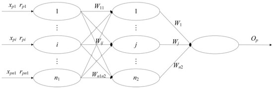 In Figure 1, r p 1 ,   r p 2 , , r p n 1 are the evaluation vector of r p within the domain of the index set after the relative nondimensionalized function calculation and marked as r p = ( r p 1 ,   r p 2 , , r p n 1 ) ; W i j ( i = 1,2,…, n 1 ; j = 1,2,…, n 2 ) refers to the connecting weight coefficient from unit i at the input layer to unit j at the hidden level; W j ( j = 1,2,…, n 2 ) refers to the connecting weight coefficient from unit j at the hidden layer to unit i input level; O p is the network output of sample mode p .