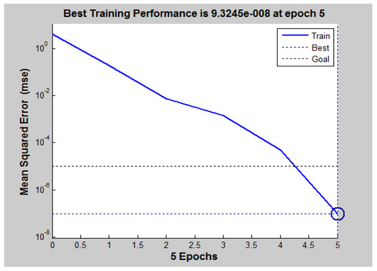 Through the questionnaire survey, the score of comprehensive evaluation of sustainable development of resettlement is determined by the Delphi five-level assignment (1, 2, 3, 4, 5) and then normalized to the value of (0,1), that is, 1, 2, 3, 4, and 5, respectively, corresponding to 0.1, 0.3, 0.5, 0.7, and 0.9. From the 217 × 2 = 434 questionnaires evaluated before and after the relocation, 400 questionnaire data were used in training by the neural network tool of the MATLAB software (MathWorks, Bern, Switzerland). The utility function “train()” was selected for training. Training parameters are established with times set at 1000 and error expectancy value at 0.00001. If the error reached 0.00001 in 1000 times of training, the training is successful; otherwise, it fails, and the training continues until that number is reached. Figure 2 shows the training results. After five times of training, the error expectancy value reached 0.00001, indicating that the training was successful. Then, the remaining 34 questionnaire survey data were used as test samples for testing the trained BP neural network. It was indicated that the neural network is reliable if the error of test result is within 5% [33,34].