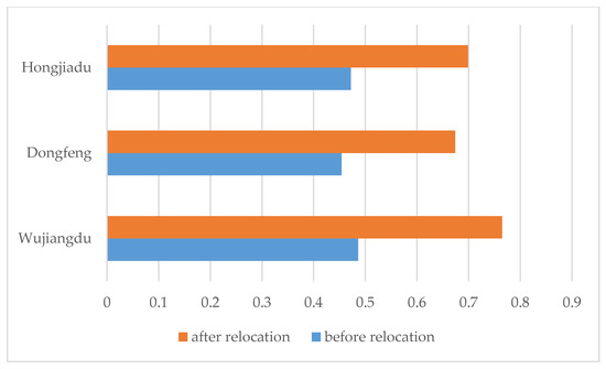 The index of environmentally sustainable development after resettlement consists of per capita housing space, the steel–concrete structure house rate, and distance to a road, school, and health center, reflecting the situations of housing, infrastructure, and public facilities. The sustainable development of housing after resettlement is embodied mainly in housing conditions, which are studied by the investigation of per capita housing space, house material quality and structure, and housing security, which is examined by investigating the number of dangerous buildings for resettlers in the resettlement area and host households in dangerous locations. Infrastructure is the development foundation of each undertaking of the resettlement economy, including roads, communication, water, gas, and electricity, and social undertakings, such as education, science, health care, and culture.