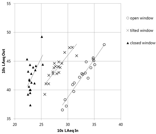 For closed windows the main influence on the indoor–outdoor differences is attributed to the mean sound level outdoors with an of 0.55 (see Figure 6). This critical finding is discussed in detail in Section 4.3.